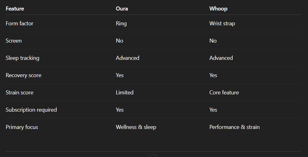 If discretion and comfort during sleep are priorities, Oura’s ring form factor may be appealing. If workout tracking is the focus, Whoop’s wrist-based design may feel more natural.